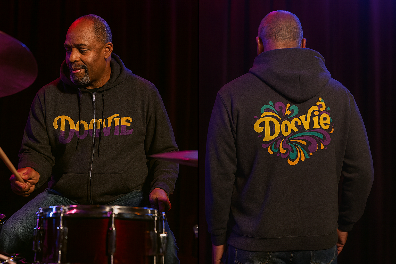This zip-up hoodie carries a playful, retro vibe—bold script lettering across the chest and a vibrant, Doovie back graphic that feels like a sunny, color-splashed memory. The medium-weight 50/50 cotton-poly fabric gives it warmth and structure without feeling bulky. Wear it on cool mornings, at your favorite concert, or while strolling through weekend markets; the roomy front pockets and adjustable hood make it easy to tuck in hands or stash small essentials. Subtle embroidery-ready space on the left chest lets you personalize it, while the metal zipper and sewn-in label speak to thoughtful, durable construction. The design’s bright yellow, purple and teal palette pops on the black background, giving an energetic, nostalgic look that suits anyone who likes expressive, art-forward streetwear.